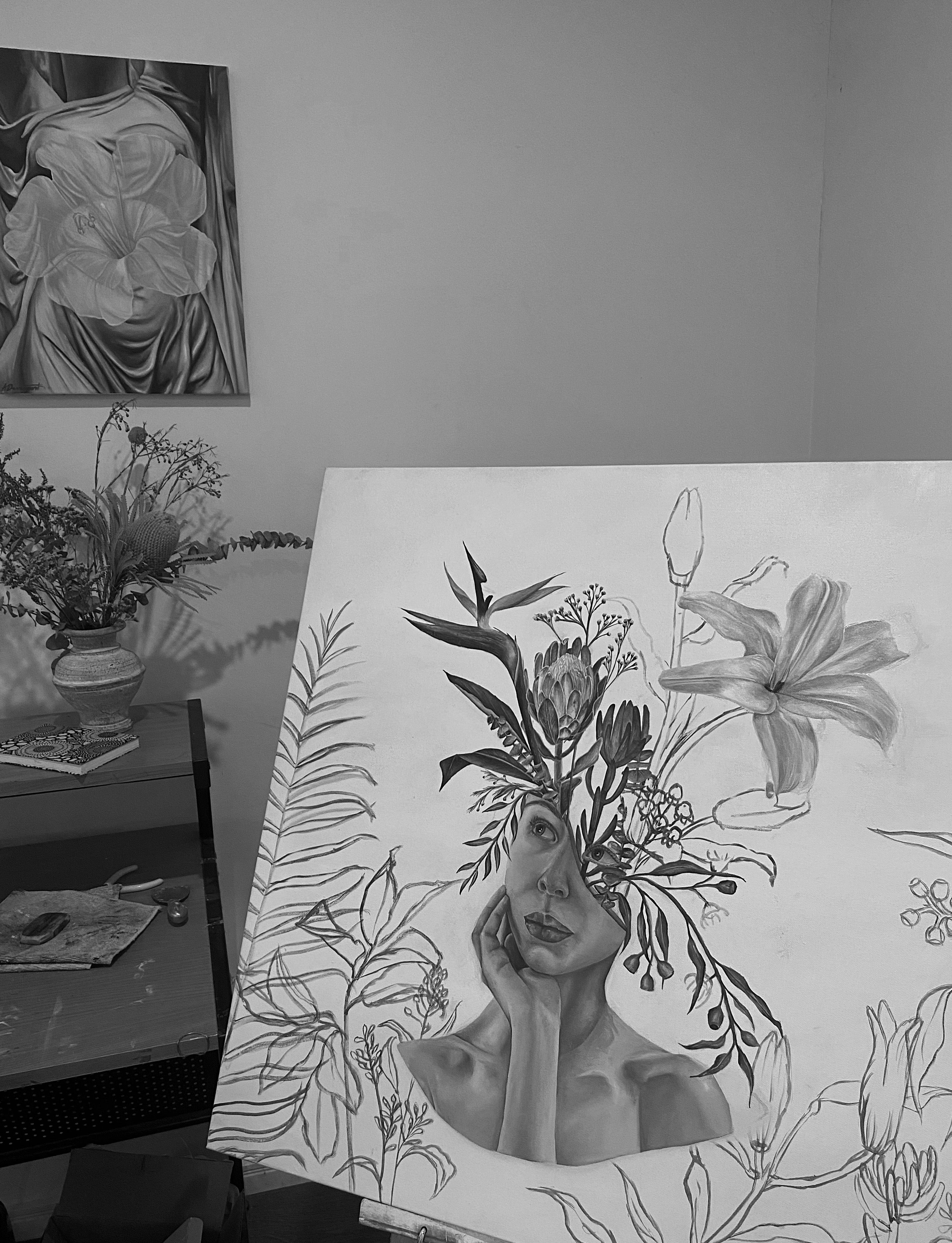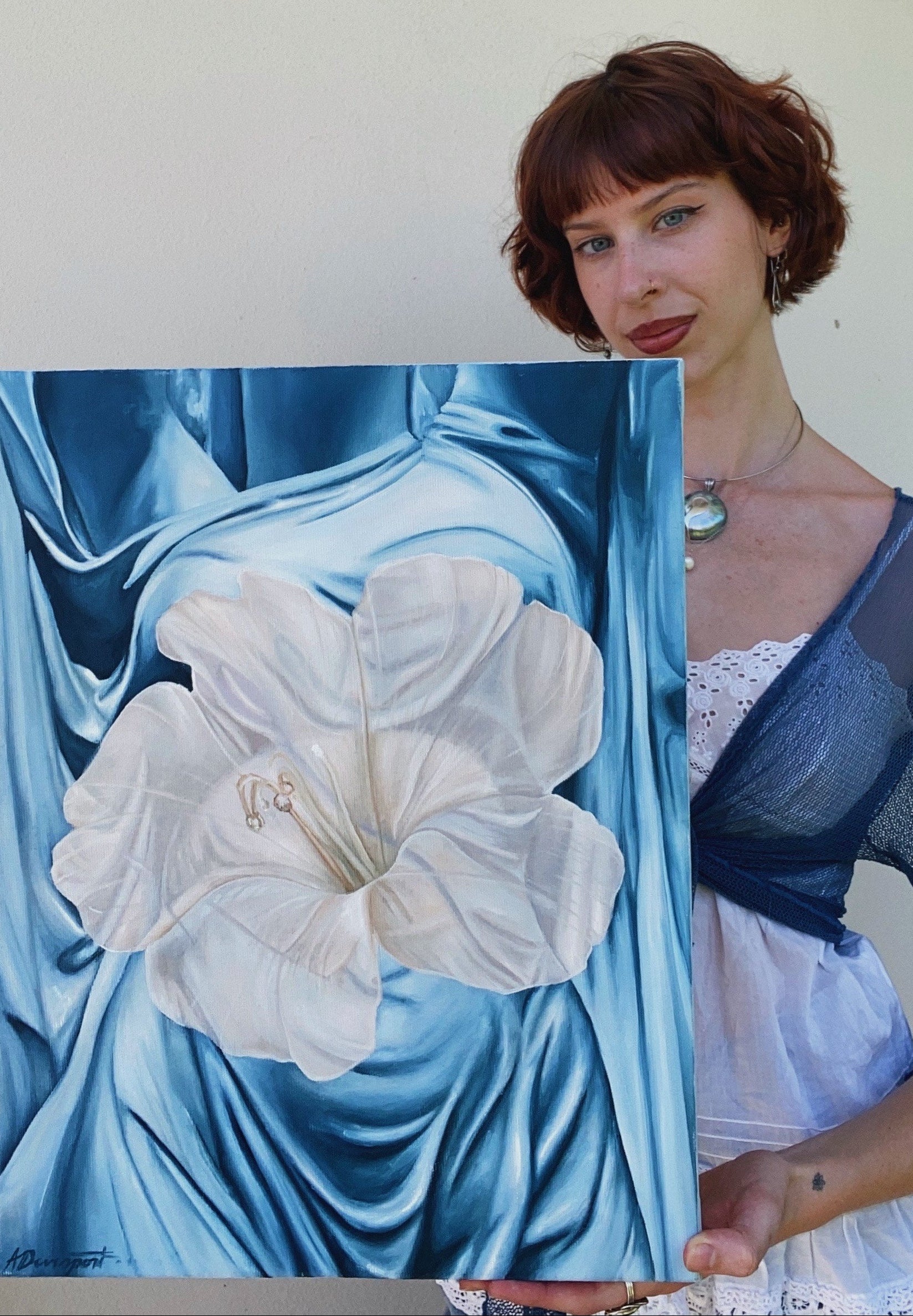 My work is built upon using detailed brush work and surrealist compositions to exude a sense of familiarity and whimsy. As my inspiration, native florals and the colour blue intertwine primarily throughout my art, influenced by the scenery I experience day to day.